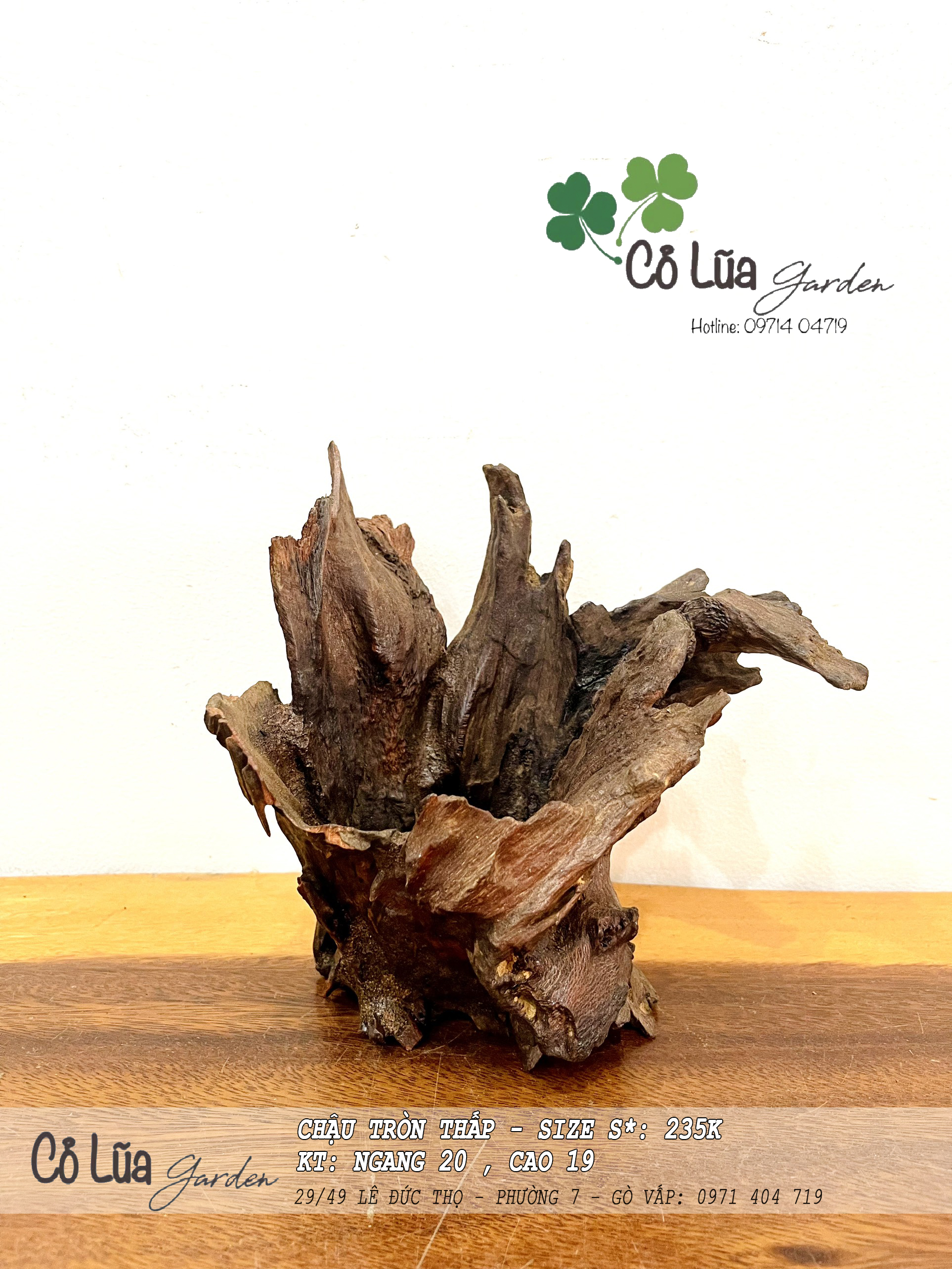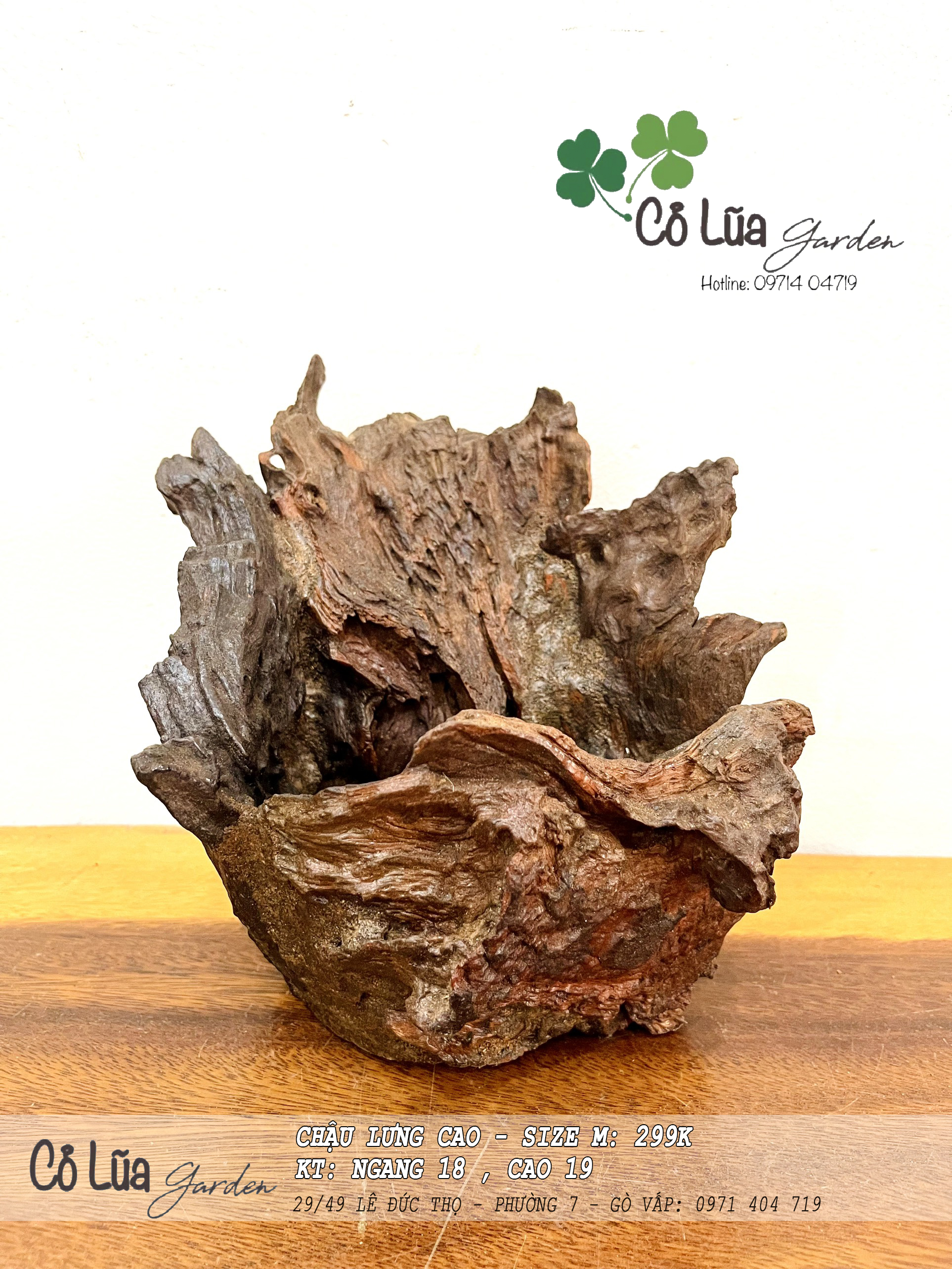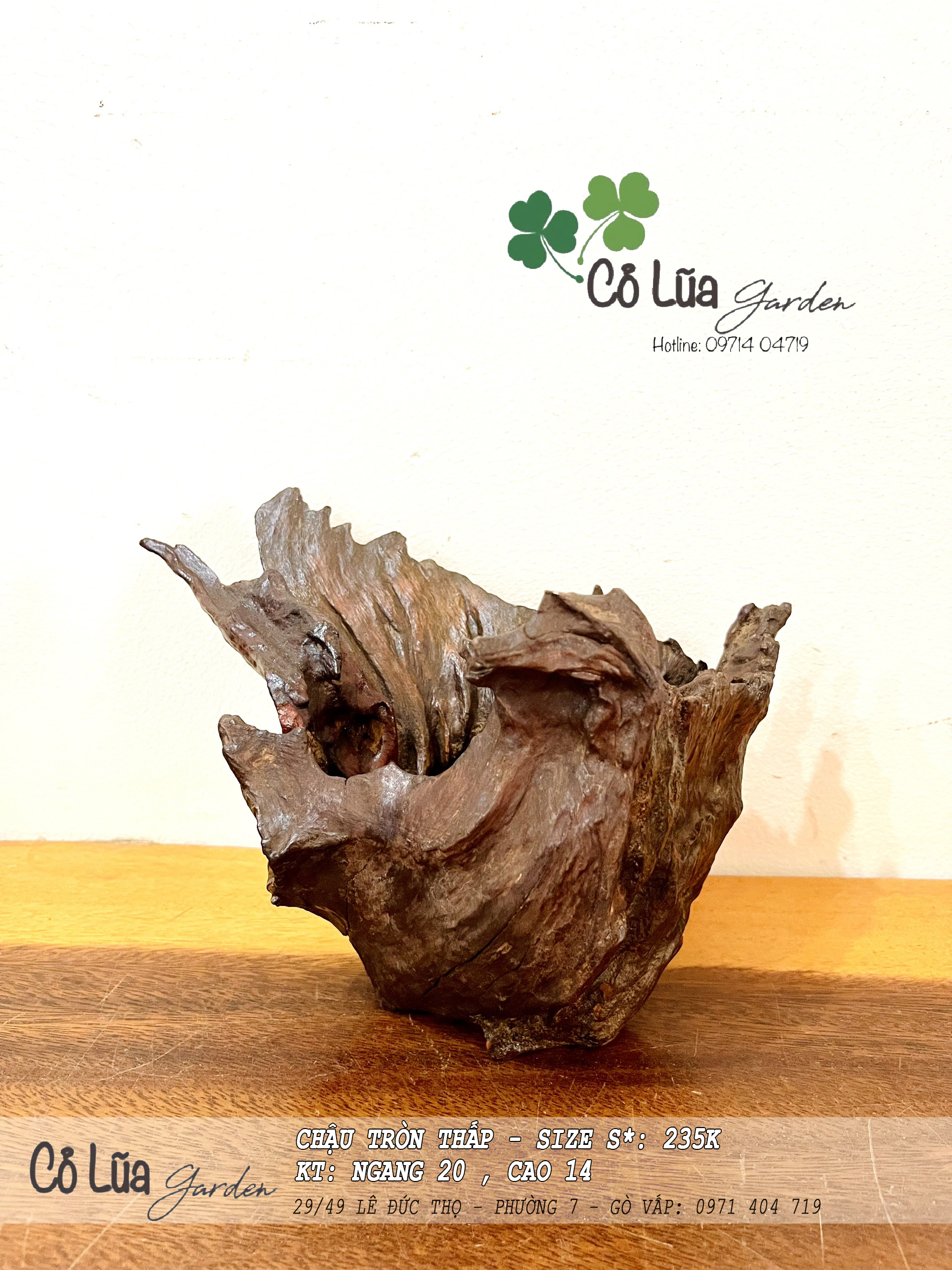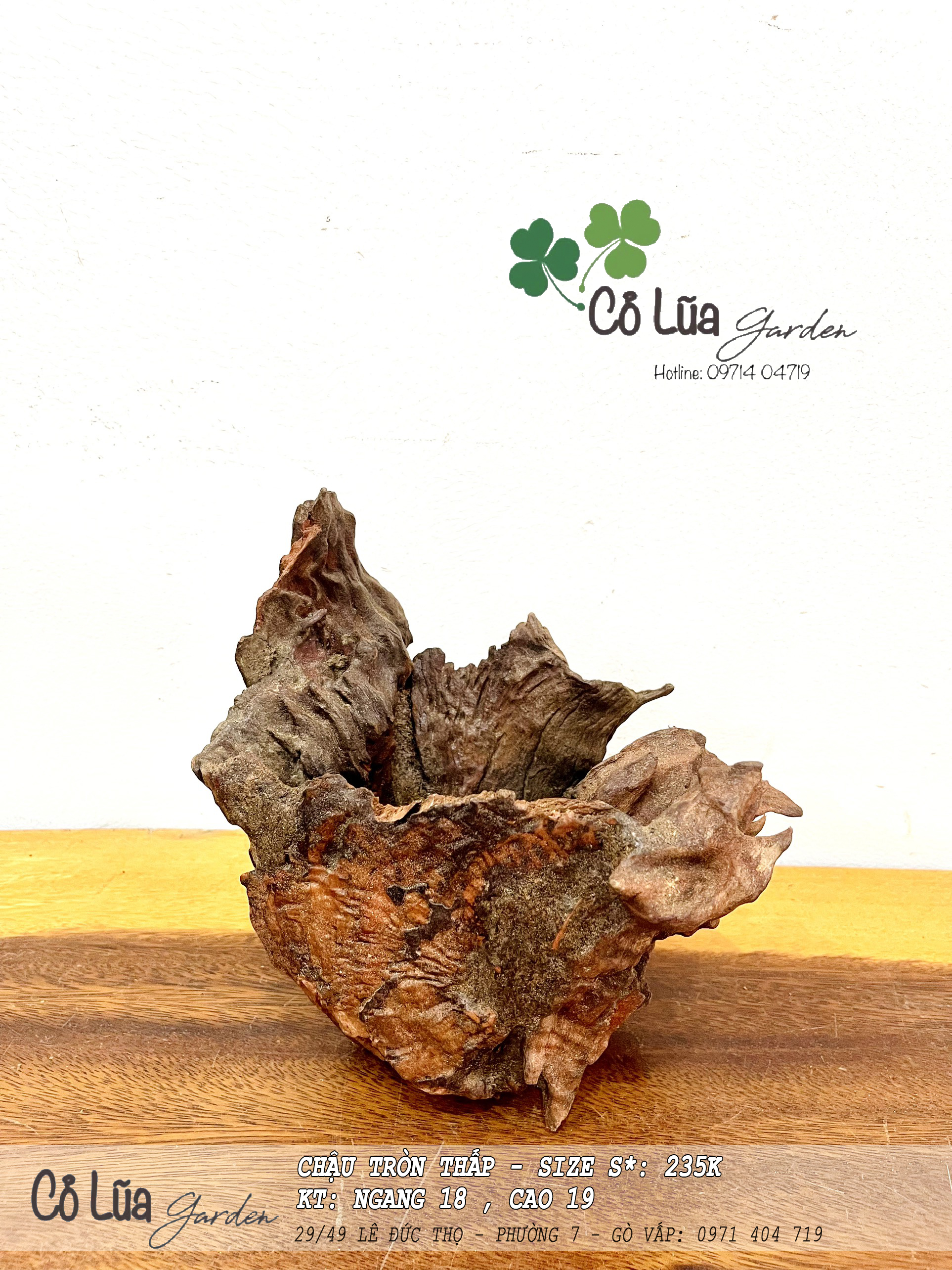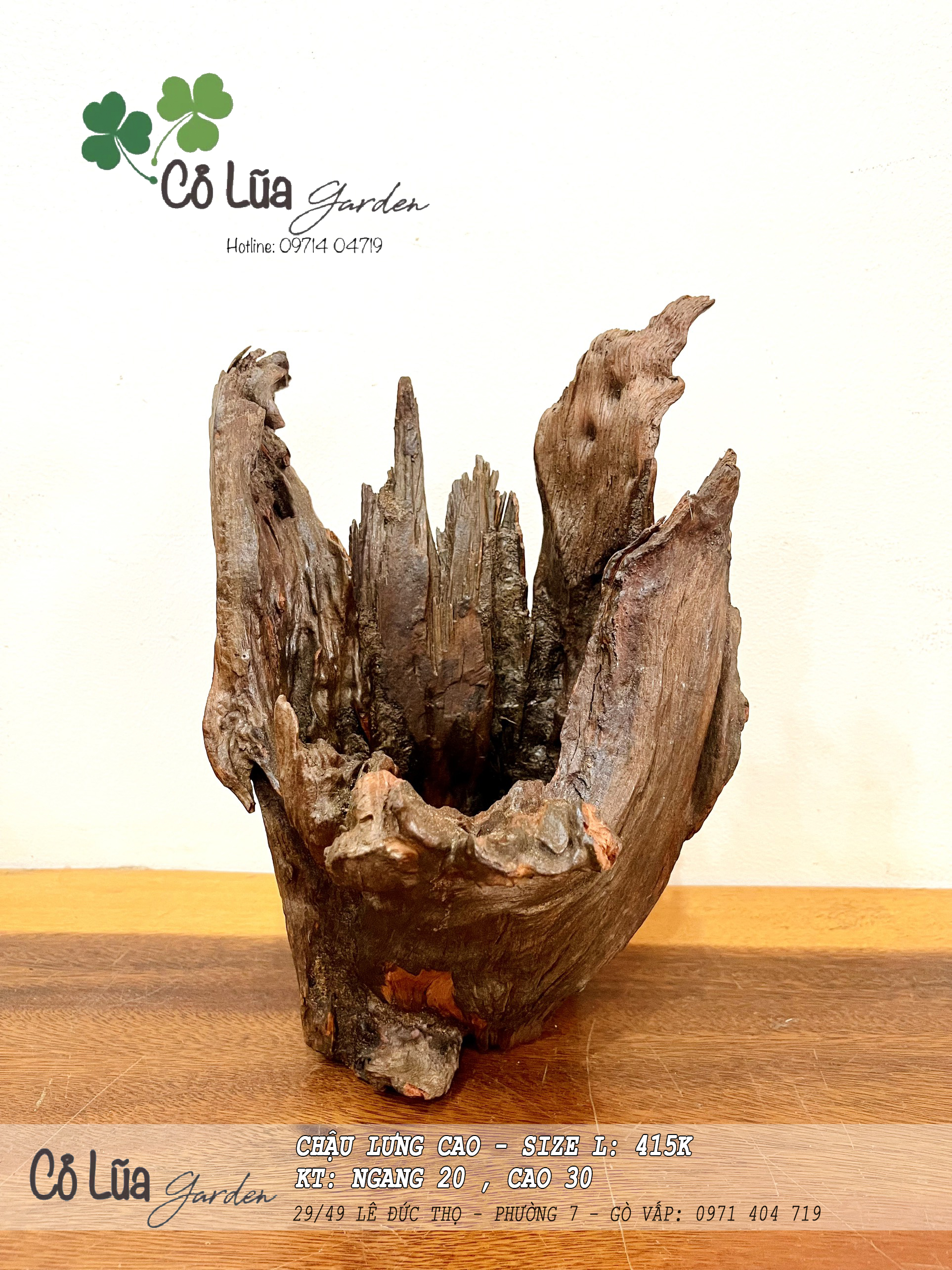 CHẬU TRỒNG CÂY BẰNG GỖ LŨA - Chất liệu: gỗ lũa tự nhiên đã xử lý thấm, mốc - Hình dáng: như hình - Kích thước: xem trên hình - Thích hợp trồng sen đá, phong lan, các loại cây hoa kiểng mini, cắm hoa tươi, hoa khô,…