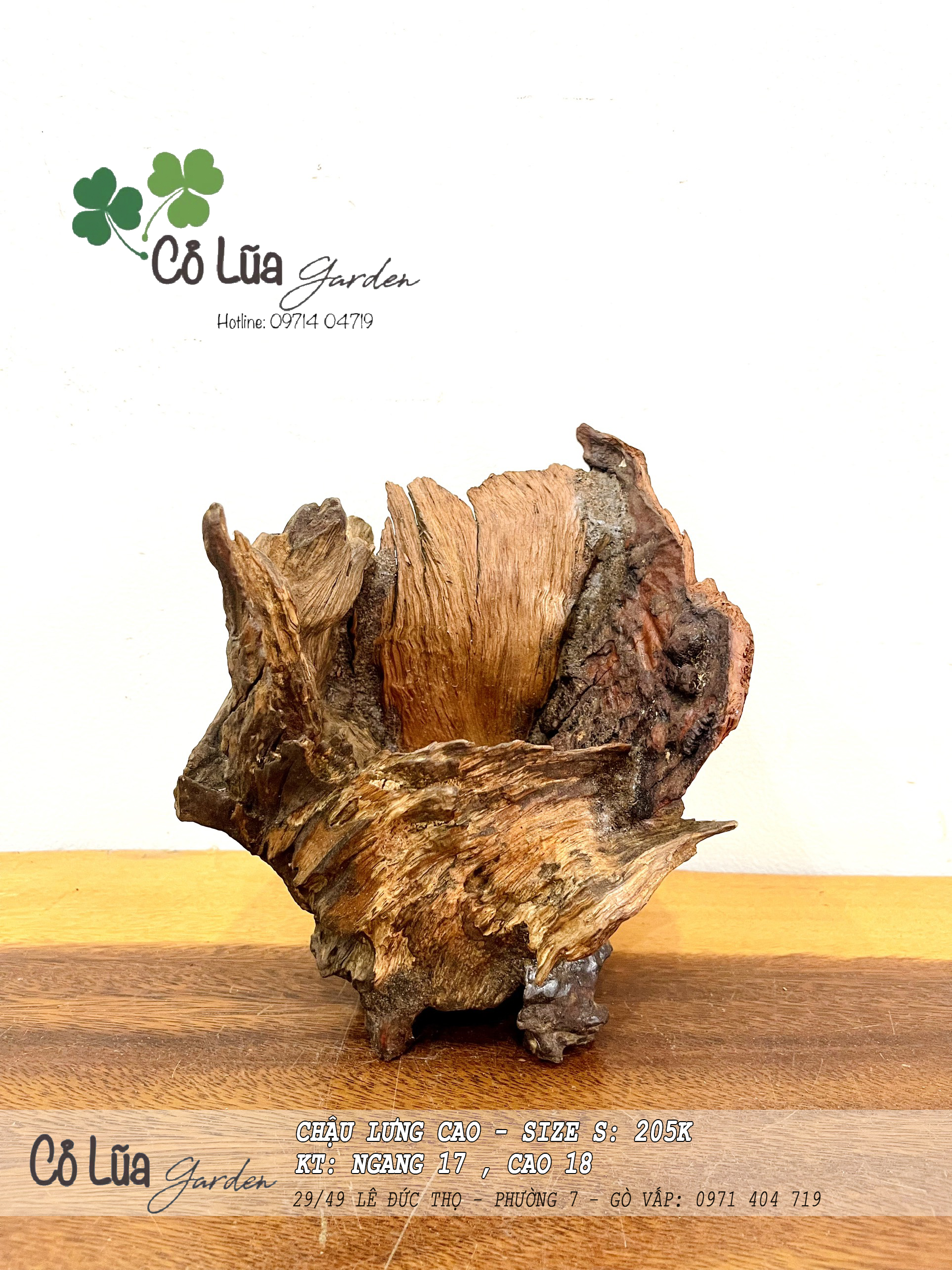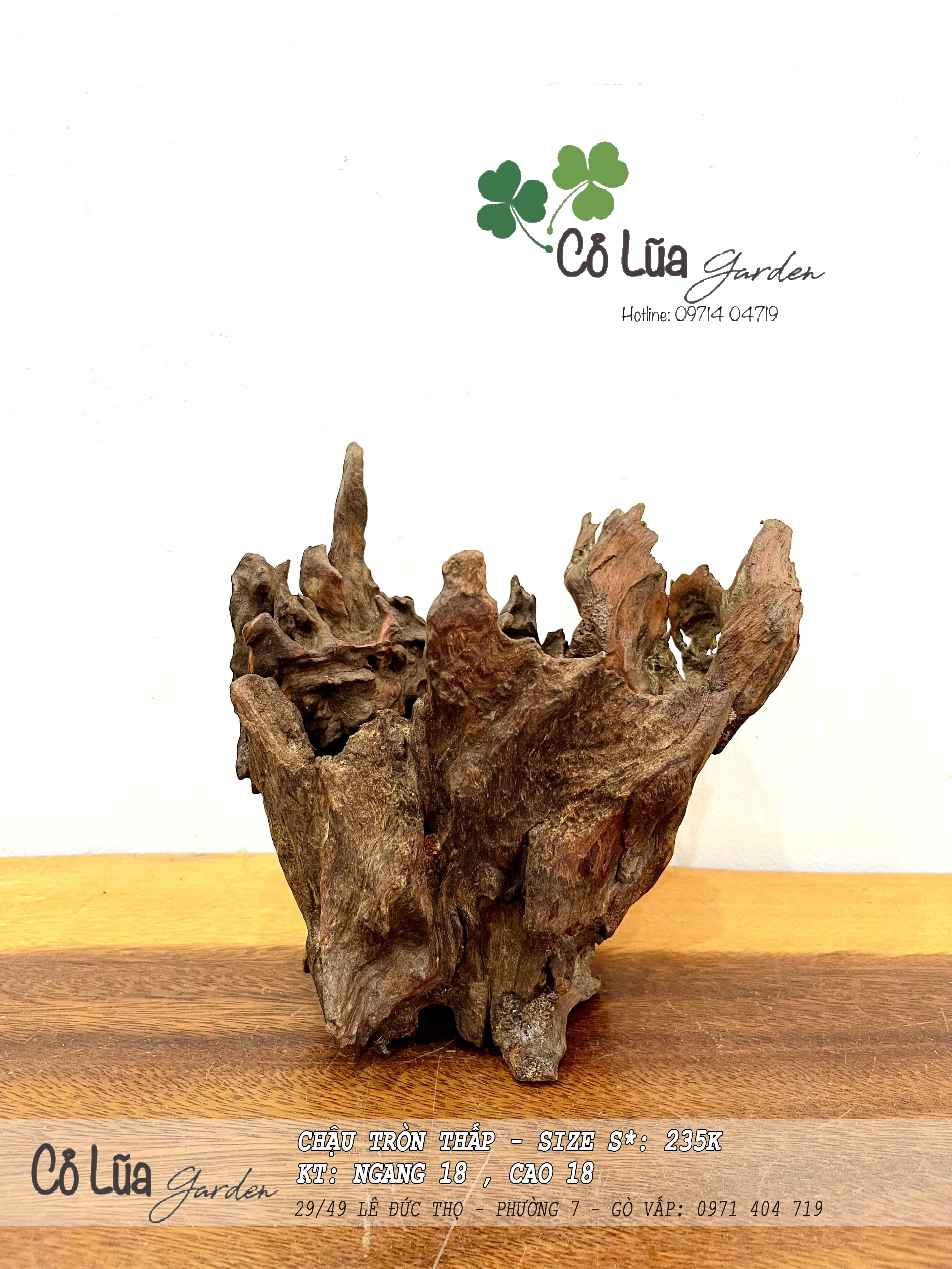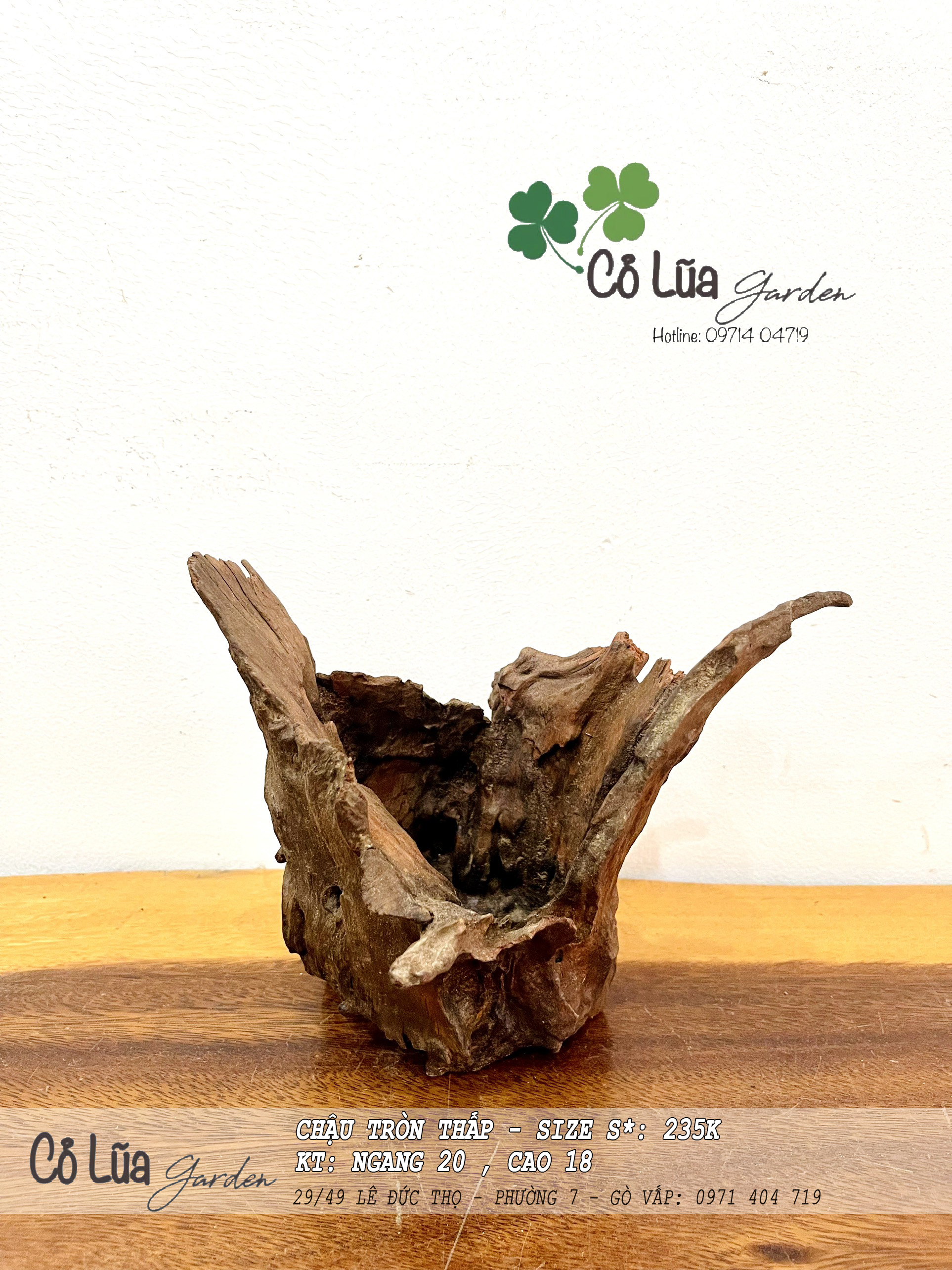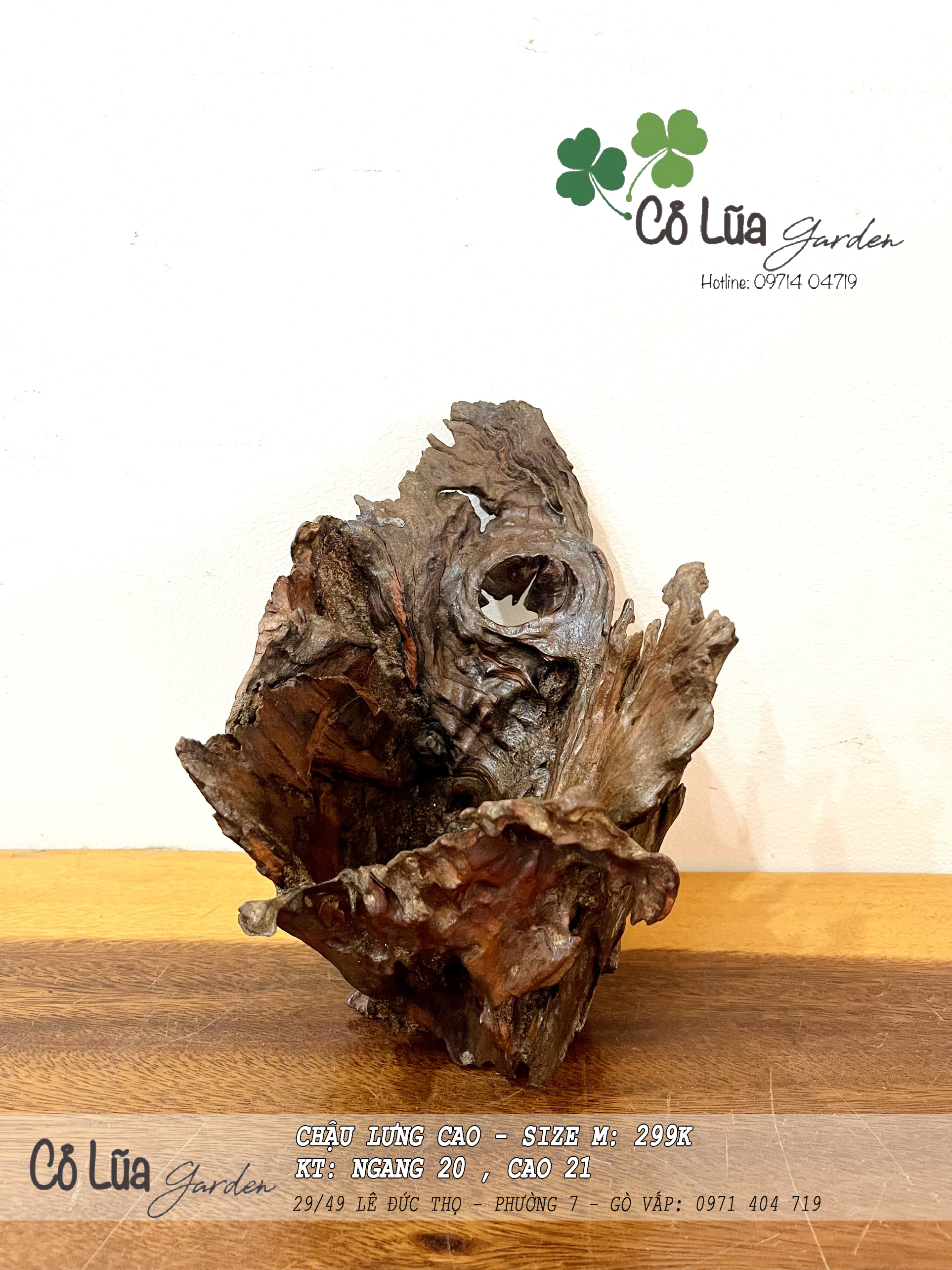 CHẬU TRỒNG CÂY BẰNG GỖ LŨA - Chất liệu: gỗ lũa tự nhiên đã xử lý thấm, mốc - Hình dáng: như hình - Kích thước: xem trên hình - Thích hợp trồng sen đá, phong lan, các loại cây hoa kiểng mini, cắm hoa tươi, hoa khô,…