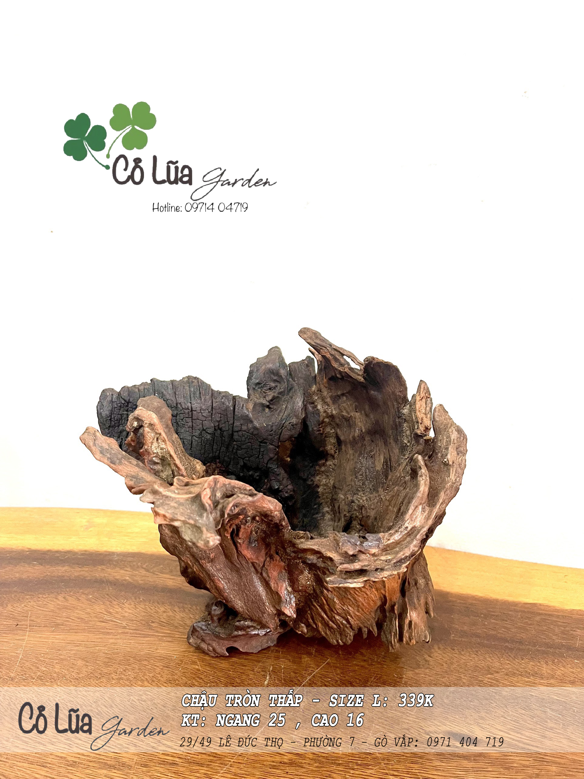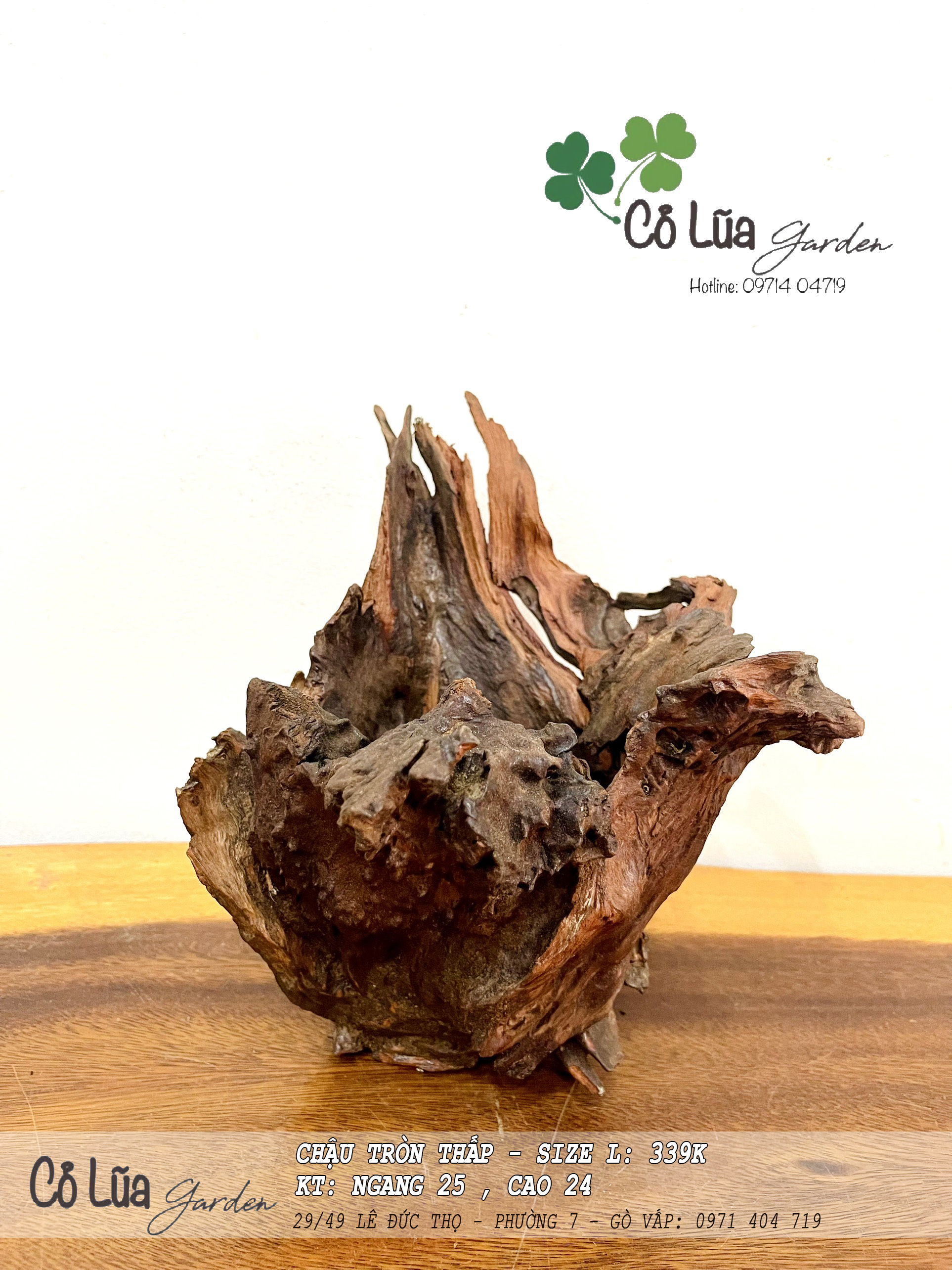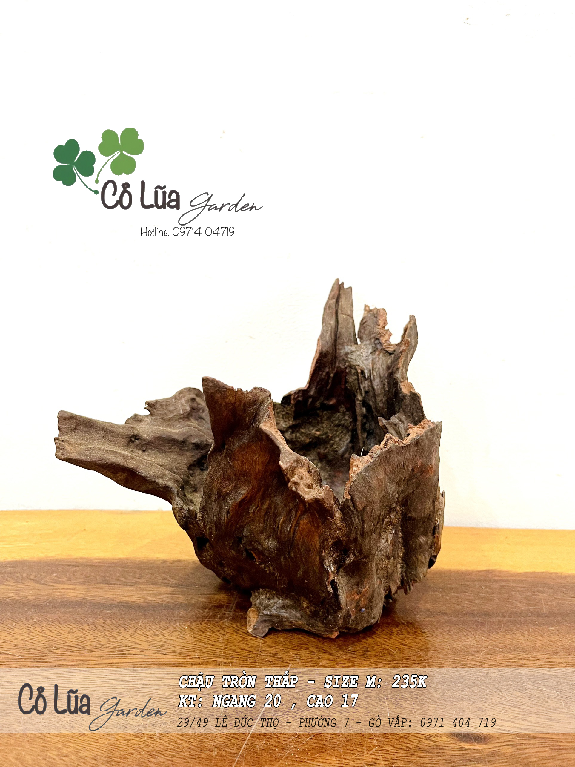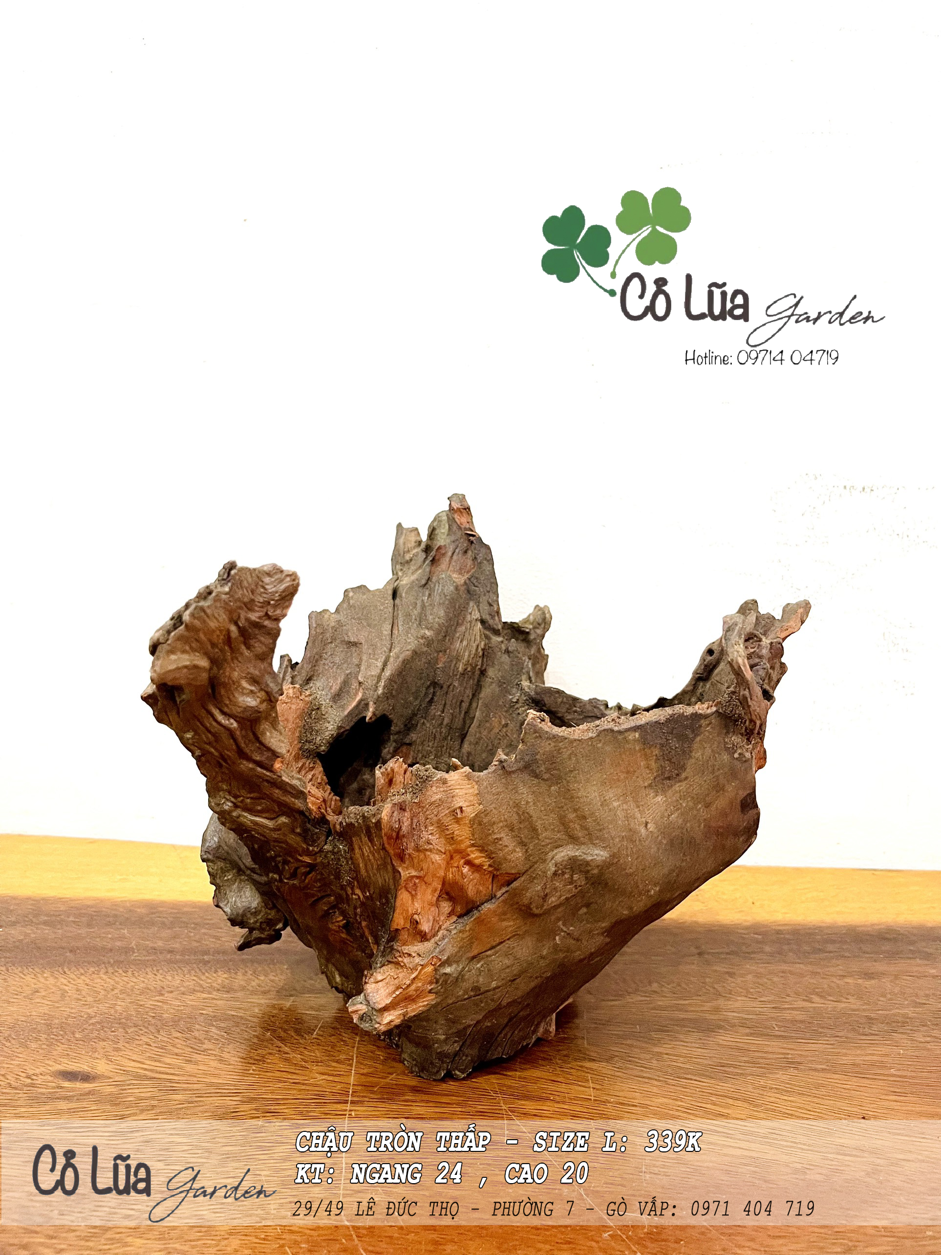 CHẬU TRỒNG CÂY BẰNG GỖ LŨA - Chất liệu: gỗ lũa tự nhiên đã xử lý thấm, mốc - Hình dáng: như hình - Kích thước: xem trên hình - Thích hợp trồng sen đá, phong lan, các loại cây hoa kiểng mini, cắm hoa tươi, hoa khô,…