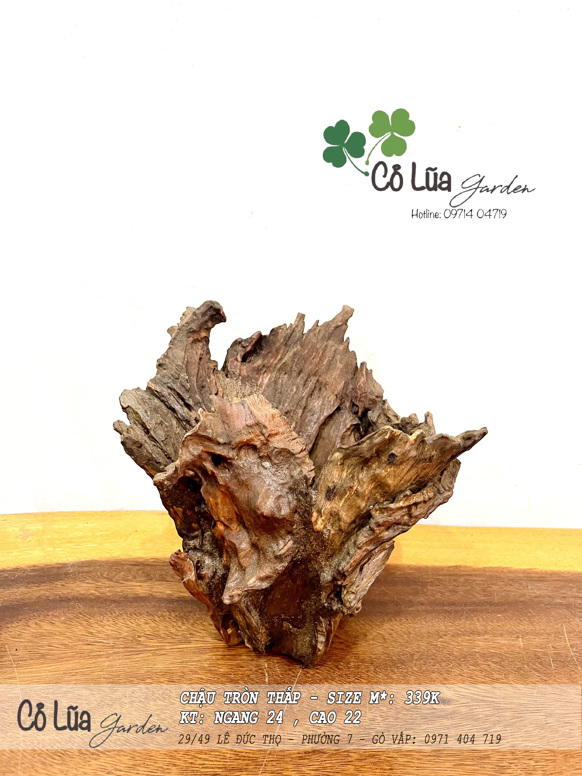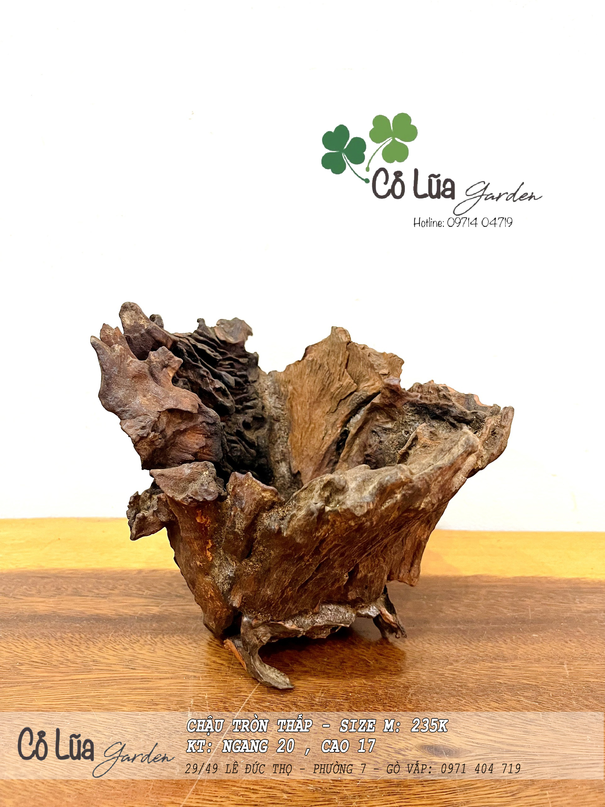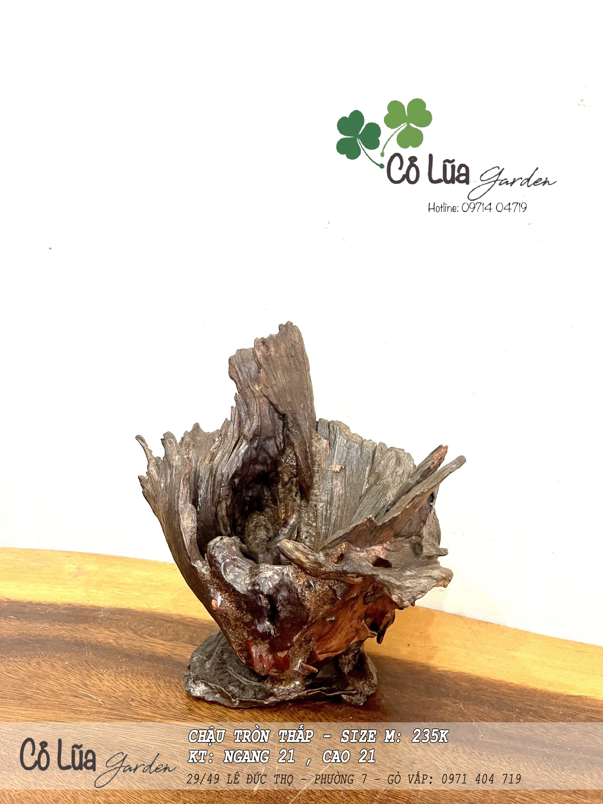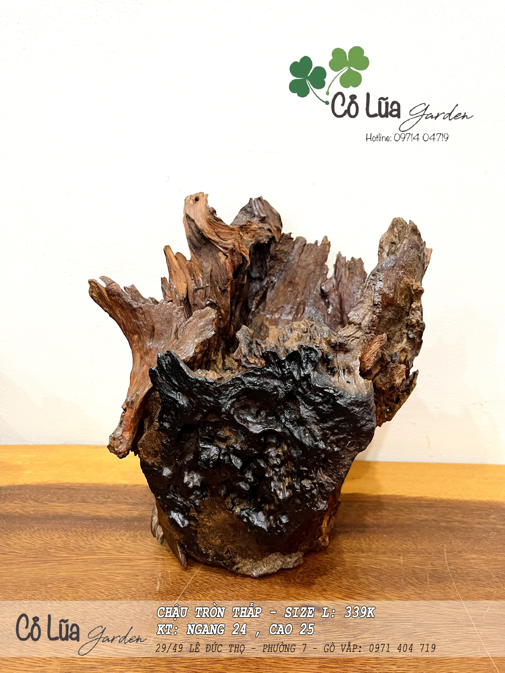 CHẬU TRỒNG CÂY BẰNG GỖ LŨA - Chất liệu: gỗ lũa tự nhiên đã xử lý thấm, mốc - Hình dáng: như hình - Kích thước: xem trên hình - Thích hợp trồng sen đá, phong lan, các loại cây hoa kiểng mini, cắm hoa tươi, hoa khô,…